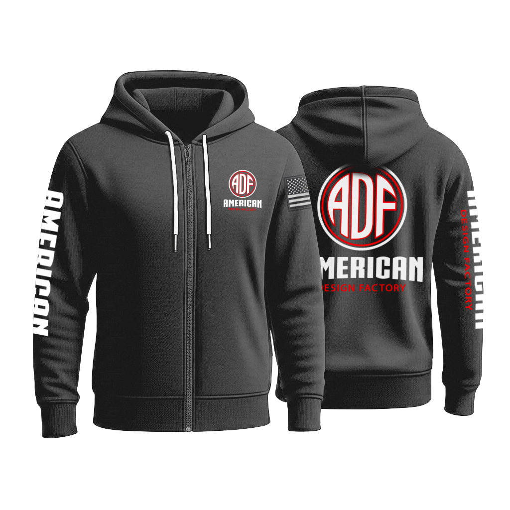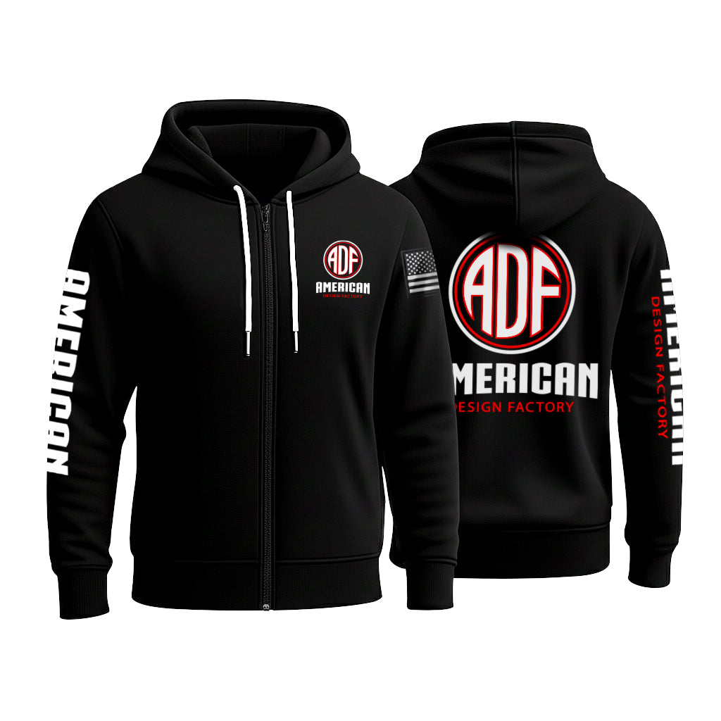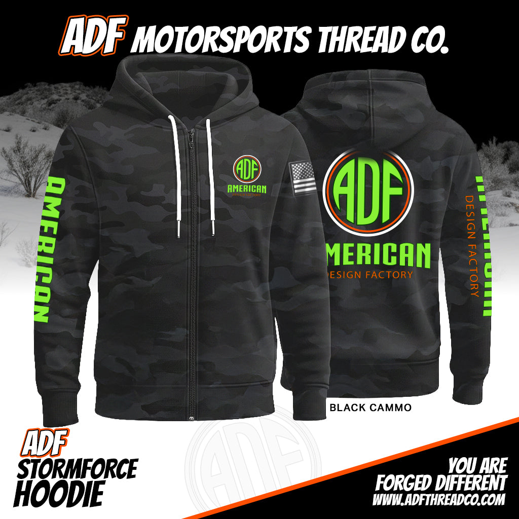 ADF STORM FORCE HOODIE Lineup Built for the road. Worn on the streets. The Storm Force Hoodie throws down contrast detailing with a white zipper and drawcord that cuts sharp against the dark fabric. Crafted from premium ring-spun cotton, it delivers smooth, bold contrast graphics and high-impact prints. Finished with race-grade construction—white #5 kissing coil zipper, nickel hardware, and ribbed cuffs, waistband, and pocket openings—this mid weight hoodie is engineered to handle the grind while keeping your look dialed in.